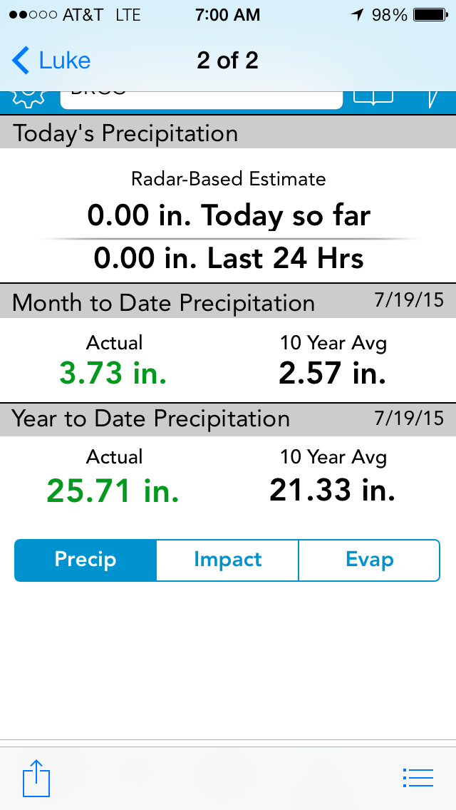 The below screen shots are interesting, if you compare the ET with rainfall for this month, ( based on a radar estimate, which I think is under estimated) rainfall outpaces ET by an inch. This means that we have a surplus of water in the soil. The situation is the absolute reverse of what we typically see thus far in June.